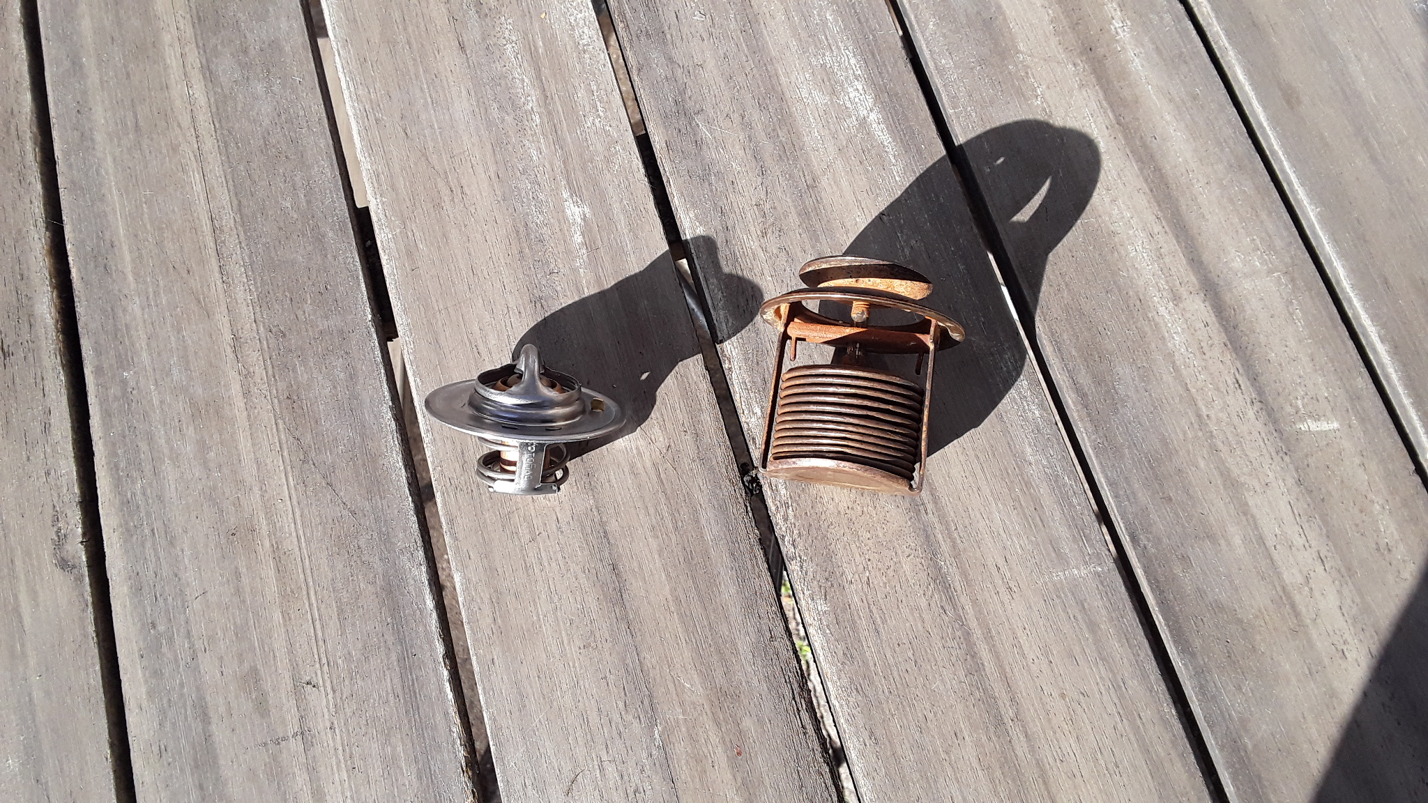 A la vu du dessus, ce doit être un Ferguson origine ouverture à env 60° (pour mon TEA20 ess) doit être indiqué sous le calorstat. L'astuce de Fabrice du percage à dû être copiée lol sur calorstat neuf, remis sur mon TEA20 le trou est fait et une petite goupille est insérée dedans. Sur mon fergie, ancien calorstat bloqué ouvert, le moteur ne chauffait pas du tout, même après plusieurs km de ballade, maintenant reste à env 80° à chaud, par contr8e une fois le moteur arrêté, ça grimpe entre 85 et 90° ensuite redescend rapidement. Je pense que c'est parce qu'il n'y a plus de ventilation et pompe à l'arrêt.