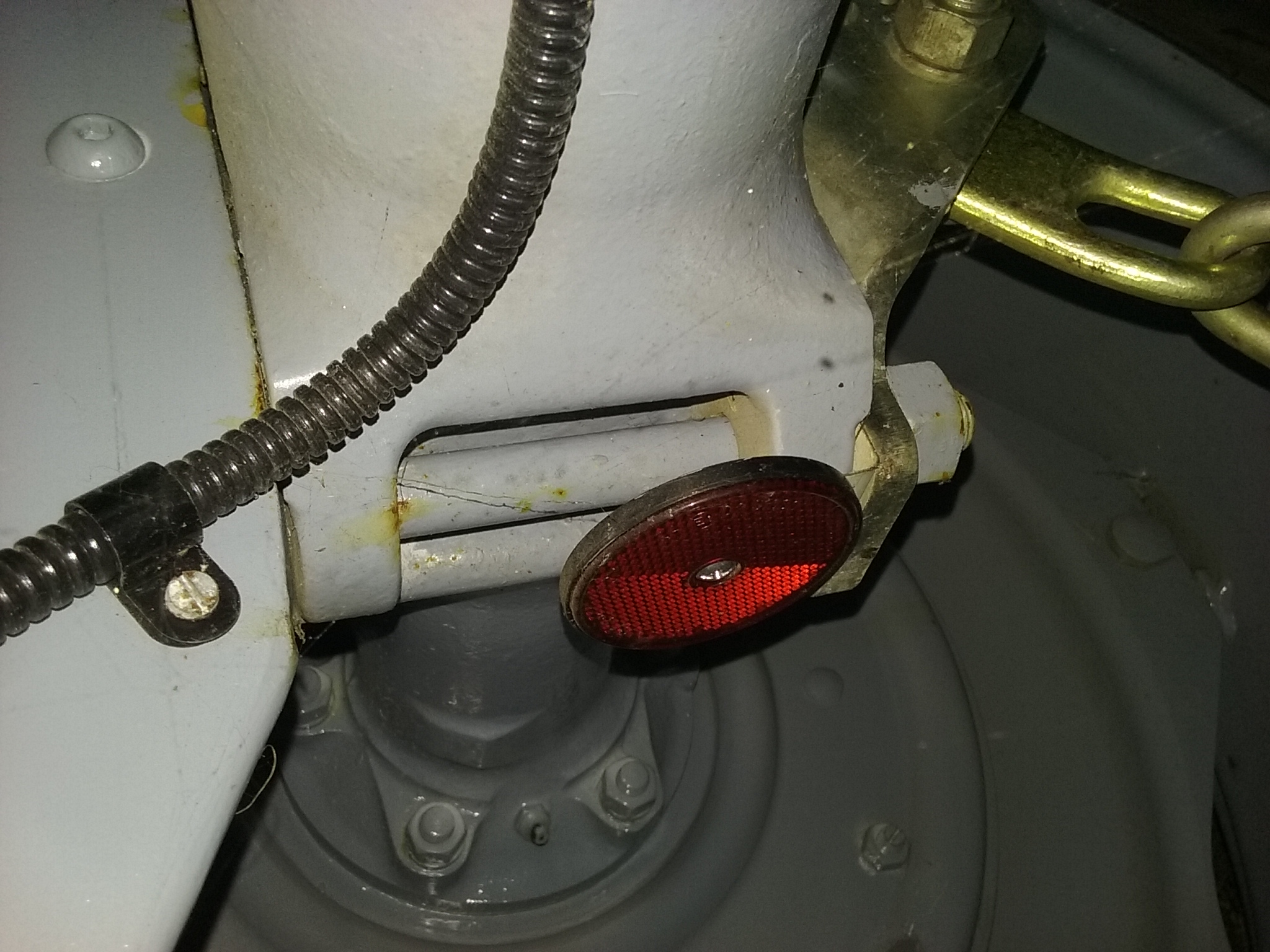 Autre solution mise en œuvre sur mon TEA : réfléchissant fixé sur une équerre métallique elle même tenue en place par l'écrou du boulon qui maintien l'aile sur la trompette